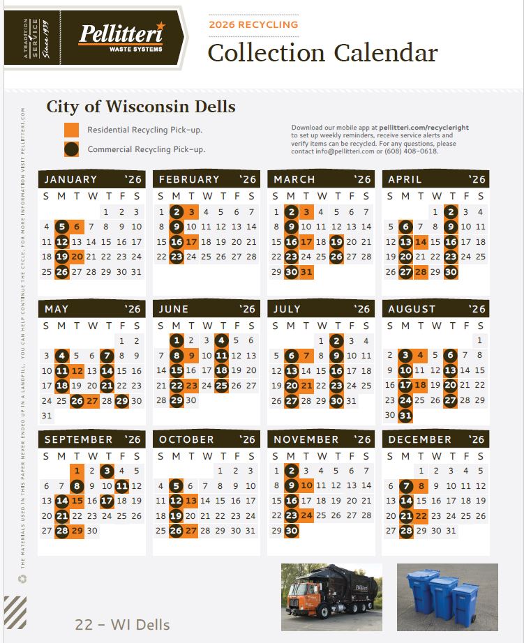 The City of Wisconsin Dell's recycling is contracted through Pelliterri Waste Systems. Recycling is picked up every other week and must be placed in a blue recycling bin purchased from Pelliterri Waste Systems. Please review the calendar below for next pick up date.